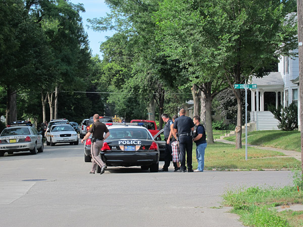 Cops were searching for the weapon in nearby yards; they said they were looking for a semi-automatic hand gun.