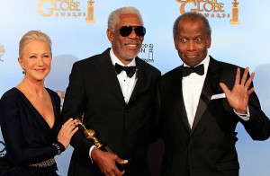 (PHOTO: Backstage after Helen Mirren and Sidney Poitier, right, presented the Cecil B. DeMille Award to Morgan Freeman, center, at the 69th Annual Golden Globe Awards show at the Beverly Hilton in Beverly Hills, California, on Sunday, January 15, 2012.)