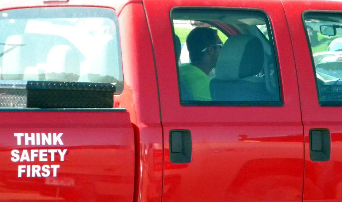 I love how the truck reads “Think safety first” and yet the driver admits that he looked away.