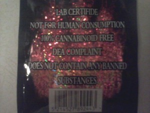 “NOT FOR HUMAN CONSUMPTION” is a simple disclaimer followed by “100% CANNIBINOID FREE” and “DOES NOT CONTAIN ANY BANNED SUBSTANCES” which implies it’s legal and you can pass a drug test.