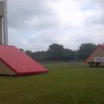 The bright red triangular rooftops that stood over the entrances to the portable classrooms are now being installed at two locations.