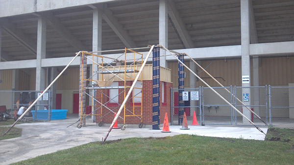 At the main entrance to Mohawk field, one of the rooftops is being installed over the ticket window.