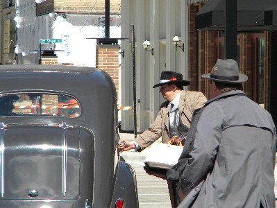 Another family of newcomers to the festival were the Rodmans, of Mason City. Ethan, age 10, Daulton, age 9 and Kaci, age 7 were enjoying meeting the actors with their father Andrew. While the boys were getting pictures taken with the “good guys” the police officers, Kaci was still wondering about the shooting. “They were shooting out the window,” she said, pointing at the window of the First National Bank Building.