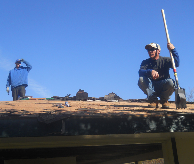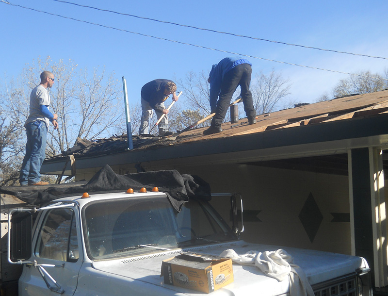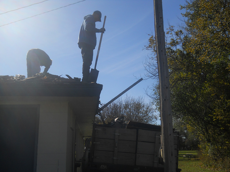 The western-most shelter house near the sledding hill had a team of roofing experts on top of the structure Saturday afternoon, scraping off the old shingles and patching some big holes at one corner.