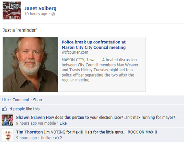 Mrs. Solberg started her attack on Mr. Weaver by posting a “reminder” about a confrontation where Second Ward Councilman Travis Hickey had approached Mr. Weaver after a city council meeting in 2011 and invaded Mr. Weaver’s personal space. A police officer escorted Mr. Hickey away from Mr. Weaver.