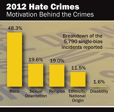 The data contained in Hate Crime Statistics, 2012 is a subset of the information that law enforcement submits to the FBI’s Uniform Crime Reporting (UCR) Program. The full hate crime report can be viewed on our website, but here are a few highlights: