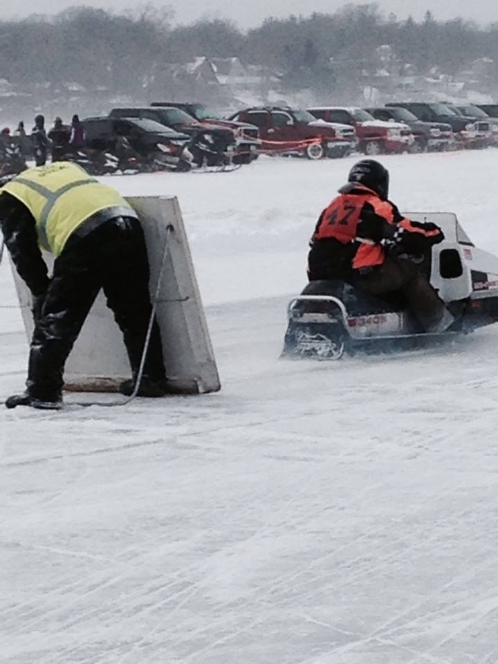 Tyler Hall, age 29, of Twin Lakes, Minnesota, had finished his race when he lost control of his snowmobile while traveling at about 75 miles per hour. His snowmobile veered off and hit a snow drift and he was thrown clear, sliding approximately 100 feet on the ice. Hall was wearing a helmet. He suffered a broken collar bone and was taken to Mercy Hospital in Mason City.