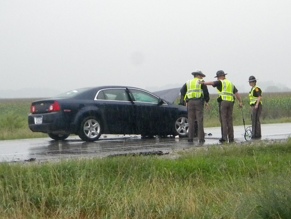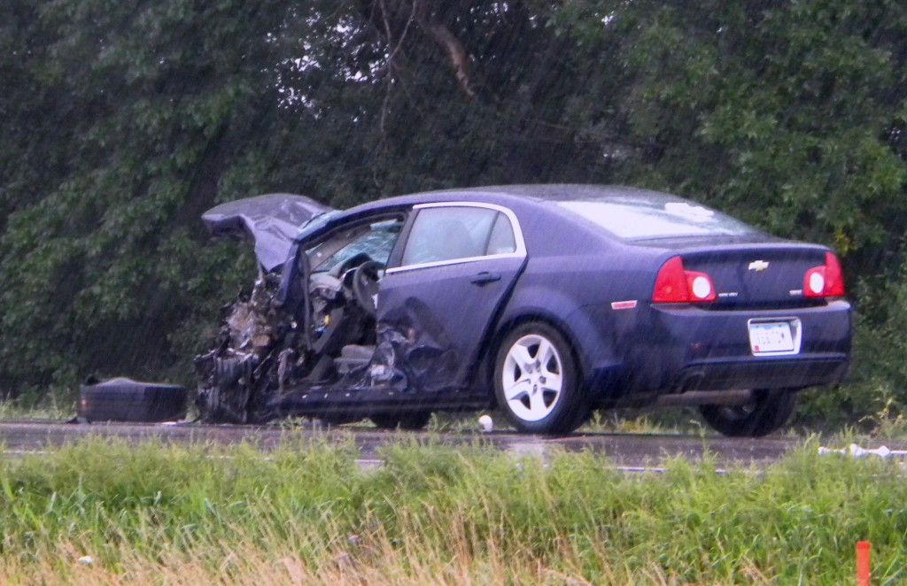 Traffic was being detoured through Manly to the east and around gravels to the west. Affordable Towing was called to haul heavily-damaged Malibu away.