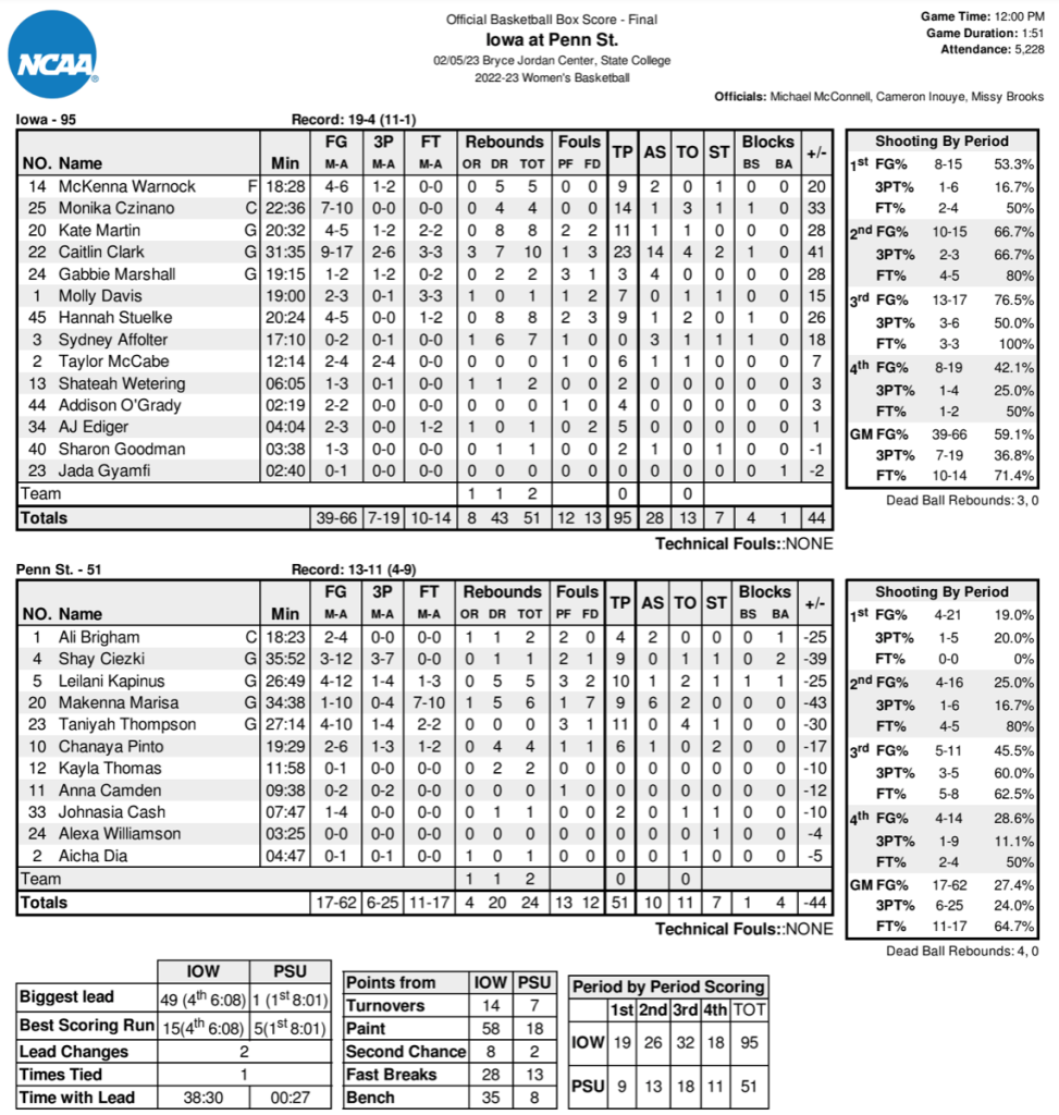 UNIVERSITY PARK, PA – Caitlin Clark’s triple-double helped #6 Iowa dominate Penn State, 95-51, inside the Bryce Jordan Center on Sunday.