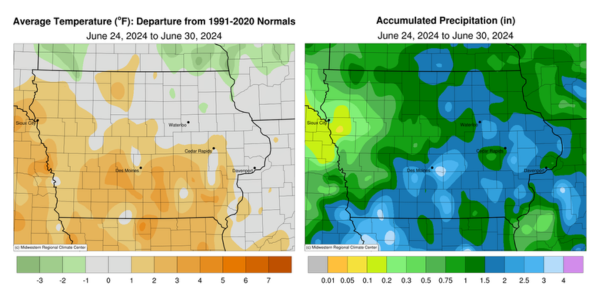 While many rivers and inland streams continue to crest from record rainfalls, June’s final reporting period was unseasonably wet. Iowa’s southeast half received above-average rainfall with below-normal totals northwest. Temperatures remained warmer across most of Iowa with near-normal conditions to the north; Iowa’s average temperature was 73.5 degrees, 1.1 degrees above normal.