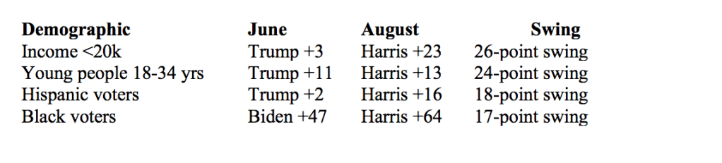 “With the ‘Brat Summer’ of Kamala Harris memes and emojis winding down, young people, persons of color, and low-income households have swung dramatically toward the vice president,” said David Paleologos, director of the Suffolk University Political Research Center.
