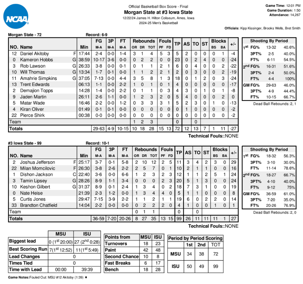 AMES – No. 3 Iowa State (10-1, 0-0 Big 12) wrapped up its non-conference season in a 99-72 victory over Morgan State (6-9, 0-0 MEAC) Sunday afternoon in Hilton Coliseum.