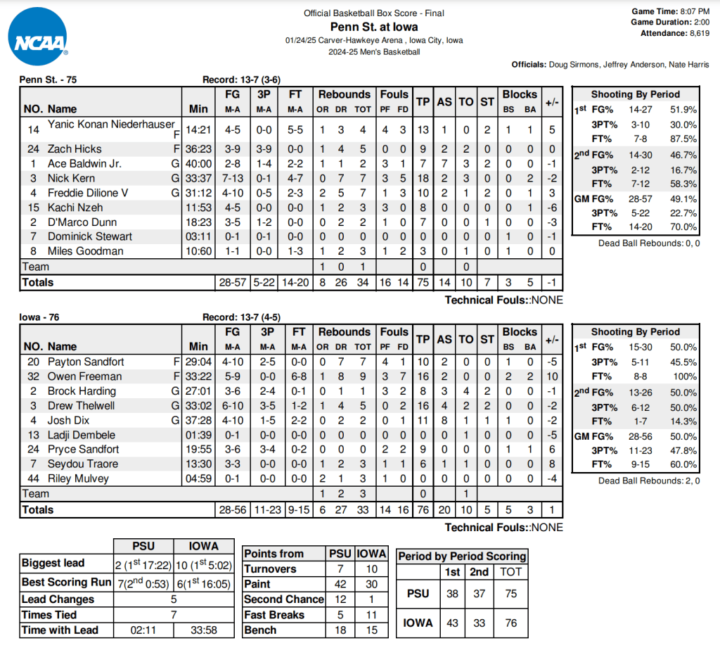 Iowa (13-7, 4-5 B1G) has now won five straight over Penn State (13-7, 3-6 B1G) in Iowa City. This was Iowa’s third win in games decided by single digits (3-4) and second win in games decided by a single possession (2-1).