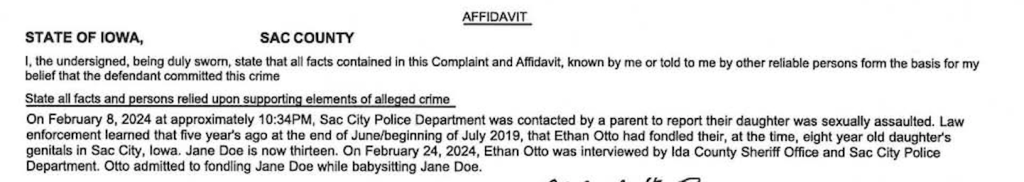 On January 31, 2025, Galva, Iowa resident Ethan Lamonte Otto was convicted of committing lascivious acts with a child, a class “C” felony. This a violation of Iowa code 709.8(1)(a), which states, “It is unlawful for any person sixteen years of age or older to perform any of the following acts with a child with or without the child’s consent unless married to each other, for the purpose of arousing or satisfying the sexual desires of either of them: Fondle or touch the pubes or genitals of a child.”