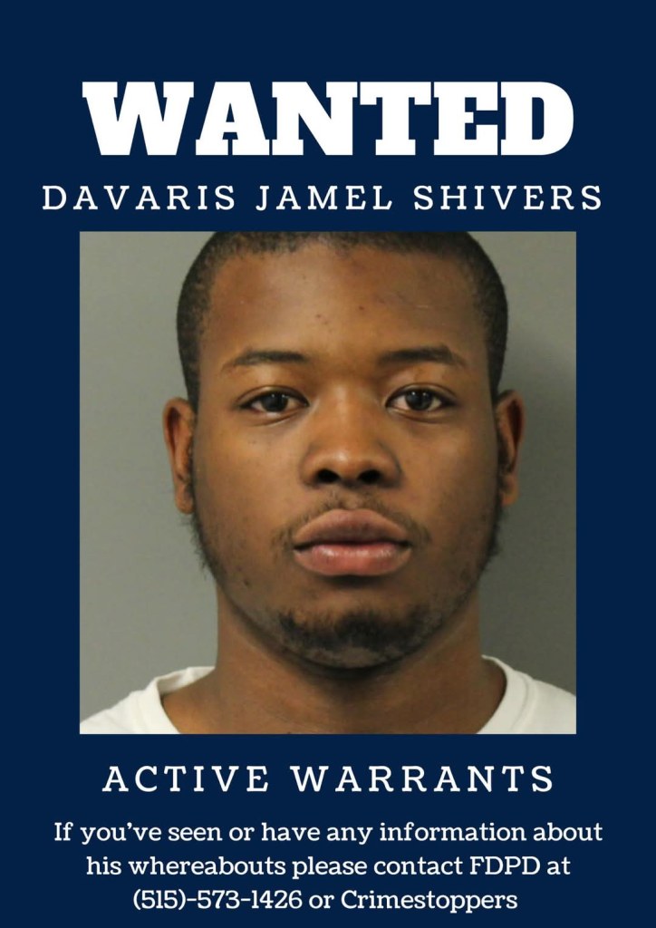 According to Fort Dodge law enforcement, 21-year-old Davaris Jamel Shivers is wanted on numerous charges, including: