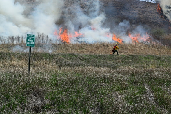 “Participants have the opportunity to gain experience in different roles from incident command, to firing boss to line boss, through planning, prepping, going through safety reviews and the fire execution,” said Doug Chafa, wildlife biologist with the Iowa Department of Natural Resources (DNR) Missouri River Wildlife Unit and one of the organizers of the annual event. “Training is the primary focus but a side benefit is we get all the ecological benefits of fire on the landscape.”