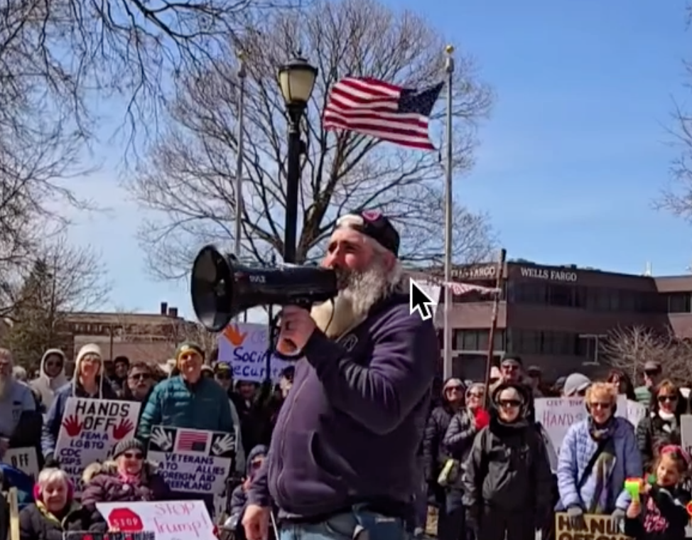 Mason City democrats offered up a speaker back on April 5 during their downtown rally, who seems to go by the name Matt Gordon and “USMC angry veteran” (pictured at top and at right). He also describes himself as “dirty grifter,” “bearded older man on bullhorn,” “discriminated against,” and others. You can find more descriptions of him on his web site, numerous social media platforms and his at least three GoFundMe campaigns, where he offers quite a sob story about busted AC units, a bad furnace and plumbing, losing his job, all while claiming to be a disabled veteran with a sick pet.