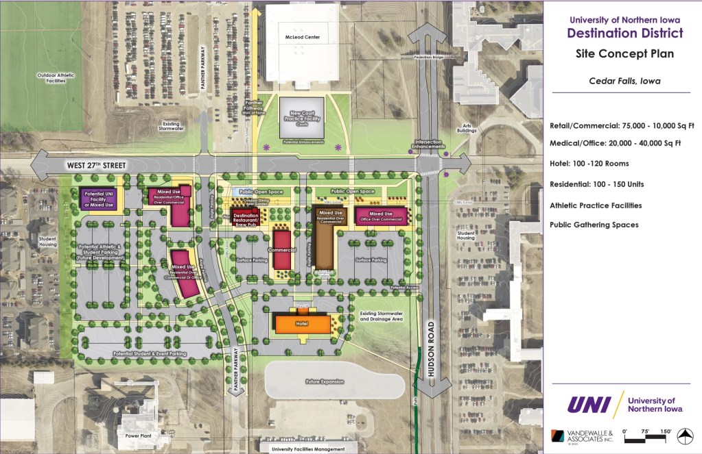 CEDAR FALLS – The University of Northern Iowa is proposing a mixed-use development known as Panther District that would add an exciting mix of restaurants, retail establishments, a hotel and housing options to the Cedar Falls community.