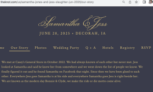According to a website, Samantha Jones (now known as Samantha Slaughter) was scheduled to get married on June 28, 2025, to Jess Slaughter. They write on their free wedding announcement website that since the pair met in October of 2022 at a Casey’s store, “we have been glued to each other. Everywhere Jess goes Samantha is at his side and everywhere Samantha goes Jess is right beside her. We are known as the modern day Bonnie & Clyde, we make the ride or die motto come alive.”