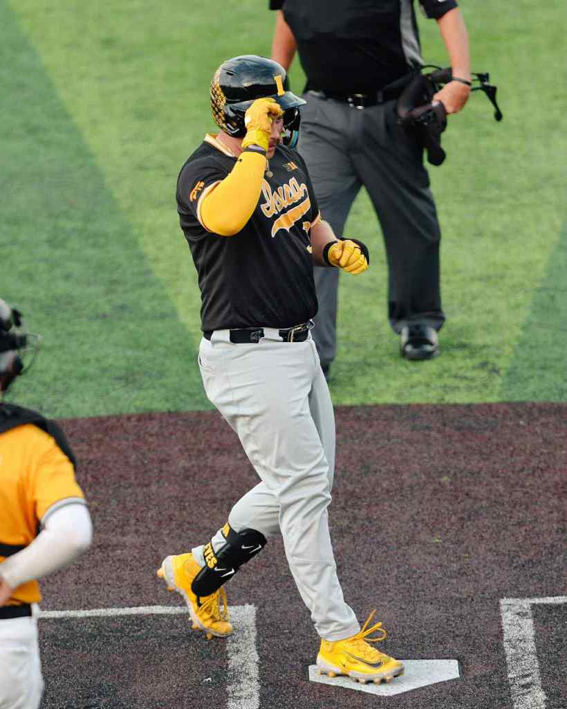 Former Newman Knight star catcher Max Burt, a sophomore, homered for the Black Team. He’s pictured at top after his home run (via Iowa Athletics).