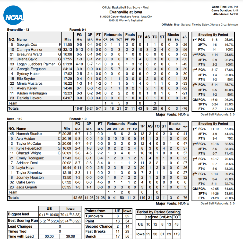 IOWA CITY – No. 21 Iowa defeated Evansville on Sunday afternoon in Iowa City, 119-43.