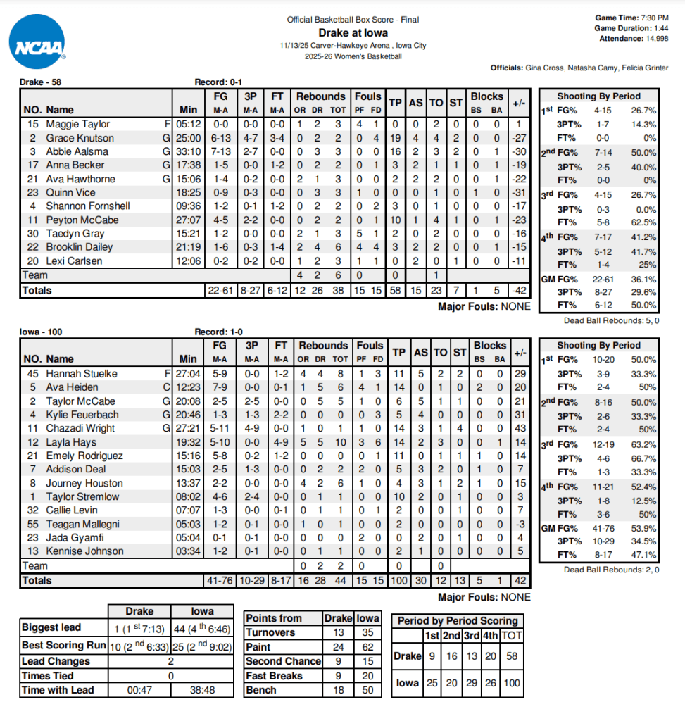 IOWA CITY – No. 21 Iowa defeated Drake on Thursday evening in Iowa City, 100-58.