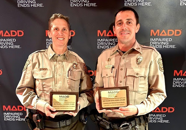 WAUKEE – Mothers Against Drunk Driving (MADD) Iowa honored Sergeant Erika Billerbeck (assigned to Johnson County) and Conservation Officer Travis Graves (assigned to Linn County) at a recognition banquet last week in Waukee.