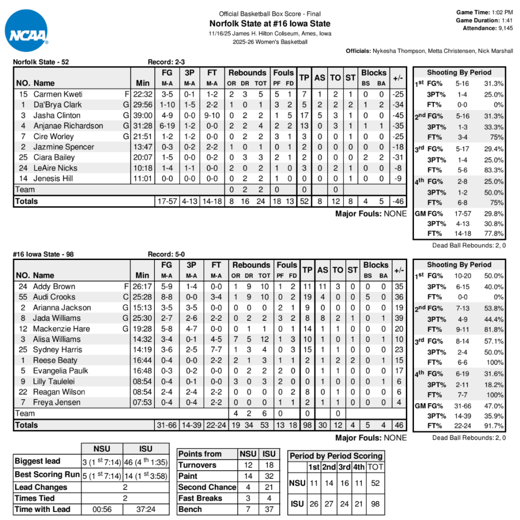 AMES – No. 16 Iowa State (5-0, 0-0 Big 12) picked up a 98-52 win over Norfolk State (2-3, 0-0 MEAC) Sunday afternoon inside Hilton Coliseum.
