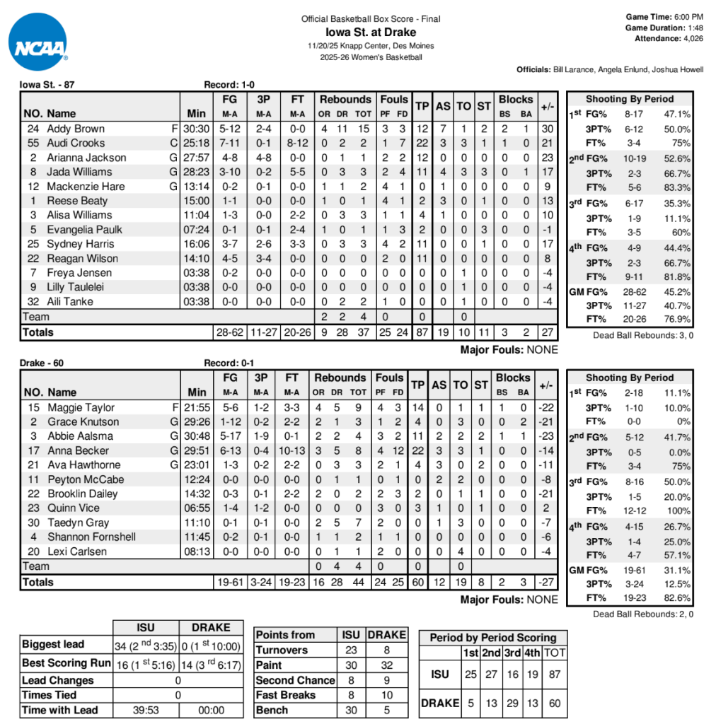 The Cyclones wasted no time getting things going, as Arianna Jackson would hit a three-pointer less than 15 seconds into the game. Jackson, with the help of layups from Addy Brown and Audi Crooks, then drained three more triples to help the Cyclones get out to a 16-0 lead before Drake would get on the board. Sydney Harris joined the party, cashing in two threes of her own to extend the lead to 25-5 after the first quarter.