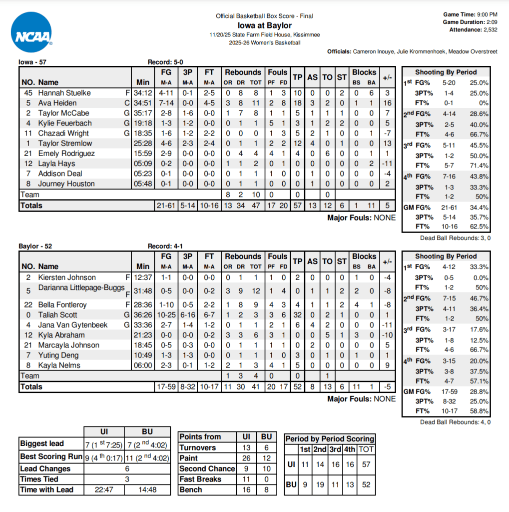 ORLANDO, FLORIDA – No. 19 Iowa (5-0) defeated No. 7 Baylor (4-1) on Thursday night in the State Farm Field House in Orlando at the Women’s Basketball Coaches Association Showcase, 57-52.