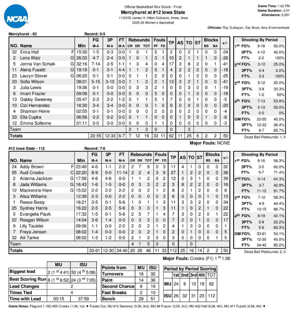 AMES – No. 12 Iowa State (7-0, 0-0 Big 12) rolled past Mercyhurst (0-5, 0-0 NEC) by a score of 112-62 Sunday afternoon inside Hilton Coliseum. Iowa State’s 7-0 start to the season matches the best start since 2021-22.