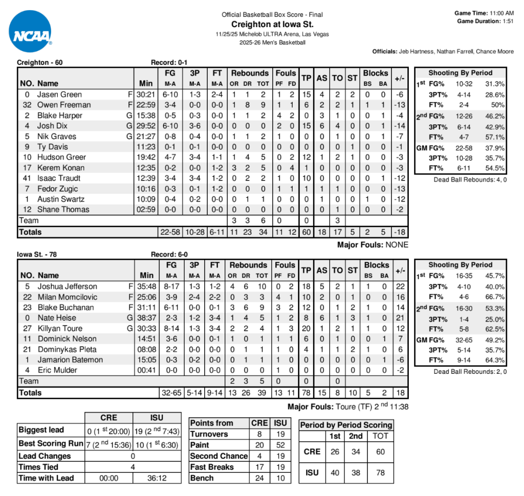 Creighton never got the score back within ten points and ISU would go on to win by 18, bringing its Players Era winning margin to 9.5.