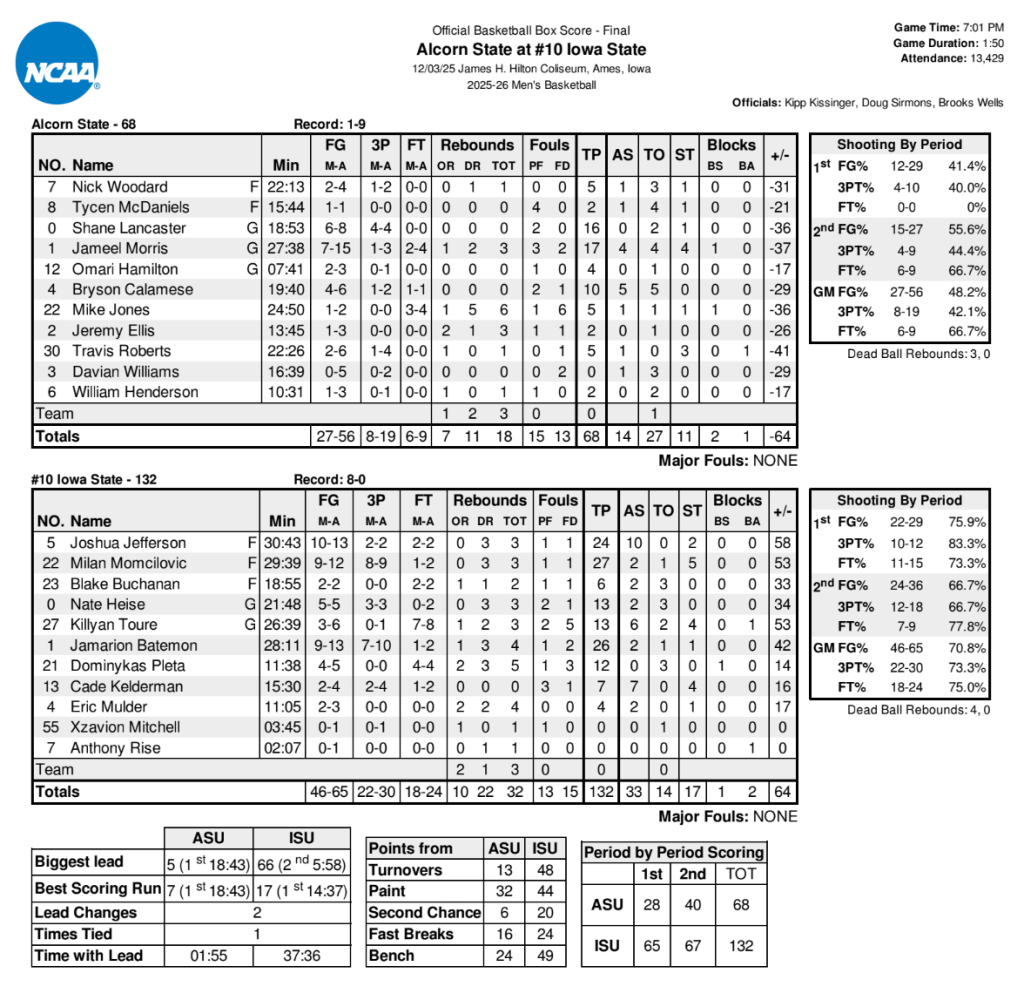After spotting Alcorn State a 7-2 lead in the first minute and a half, the Cyclones immediately took over, responding with a 33-6 run in the next seven minutes, where they made 13-of-14 field goals to take a 35-13 lead.