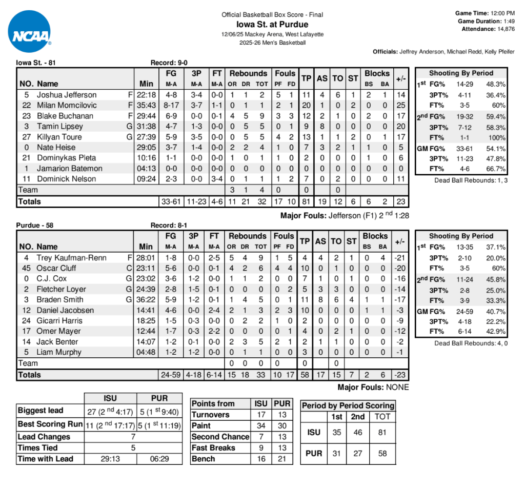 WEST LAFAYETTE, Ind. – No. 10 Iowa State (9-0) handed top-ranked Purdue (8-1) its first home, non-conference loss since 2019 as it blasted the Boilermakers by 23 points, winning 81-58.