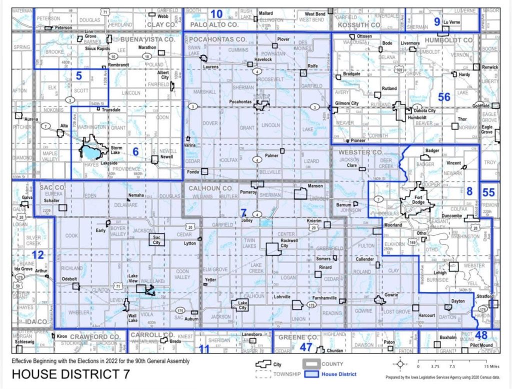 Iowa House District 7 includes Calhoun, Pocahontas, and Sac Counties and part of Webster County.