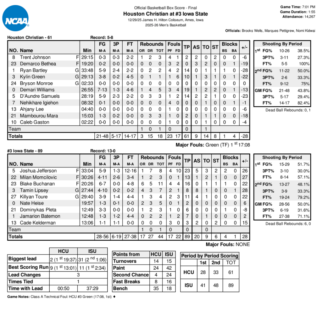 AMES – No. 3 Iowa State (13-0) will begin Big 12 competition unbeaten after defeating its school-record 42nd-straight non-conference opponent in Hilton Coliseum in an 89-61 victory over Houston Christian (5-8) Monday night.