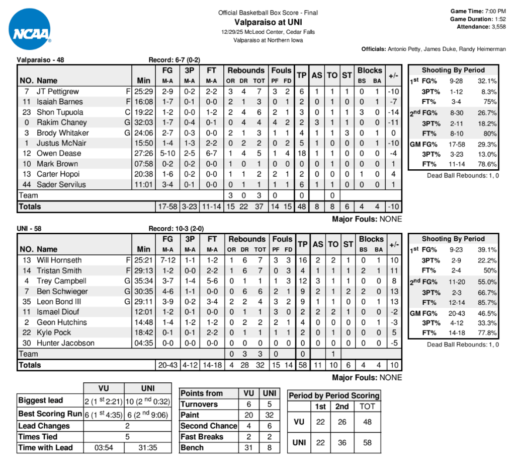UNI jumped out to an early 8-3 lead on the Beacons but would struggle down the stretch of the first half, being held to 39.1% shooting in the first 20 minutes of action. The Panthers defense would stand strong holding Valparaiso to 32.1% from the field despite being outrebounded by a 22-14 margin. The Beacons would take a 22-20 lead amid a five-minute scoring drought for UNI before Will Hornseth, who led the Panthers with seven first half points on three-of-six shooting, tied the game at 22-22 heading into halftime.
