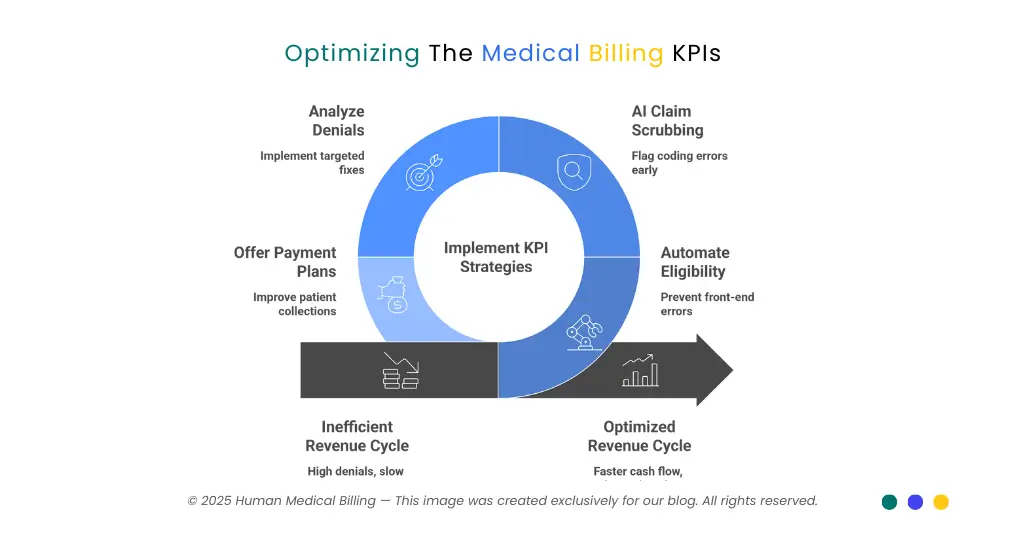Medical billing KPIs provide the insight healthcare practices need to manage financial performance effectively. By tracking metrics such as days in AR, clean claim rate, denial rate, and net collection rate, practices gain visibility into where revenue is earned, delayed, or lost.