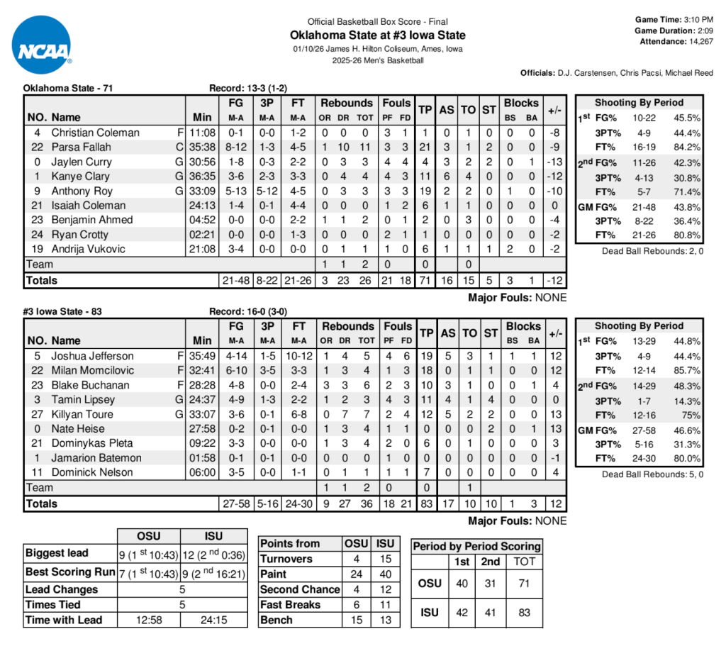 The Cyclones outrebounded OSU (36-26) and won the second-chance points battle (12-4). ISU also dominated the points in the paint, scoring 40 to Oklahoma State’s 24.