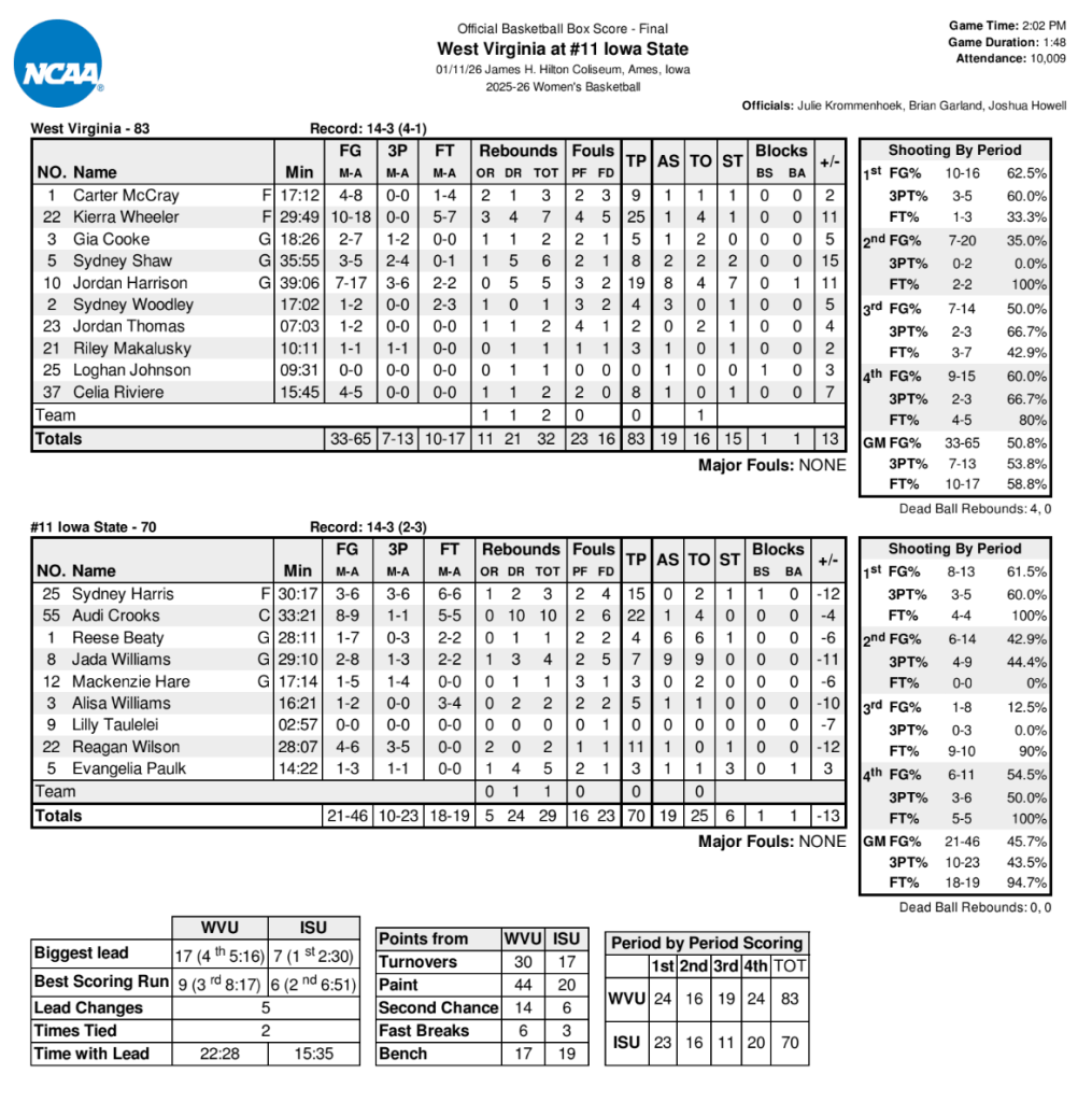 AMES – No. 11 Iowa State (14-3, 2-3 Big 12) lost to West Virginia (14-3, 4-1 Big 12) by a final of 83-70 Sunday afternoon.