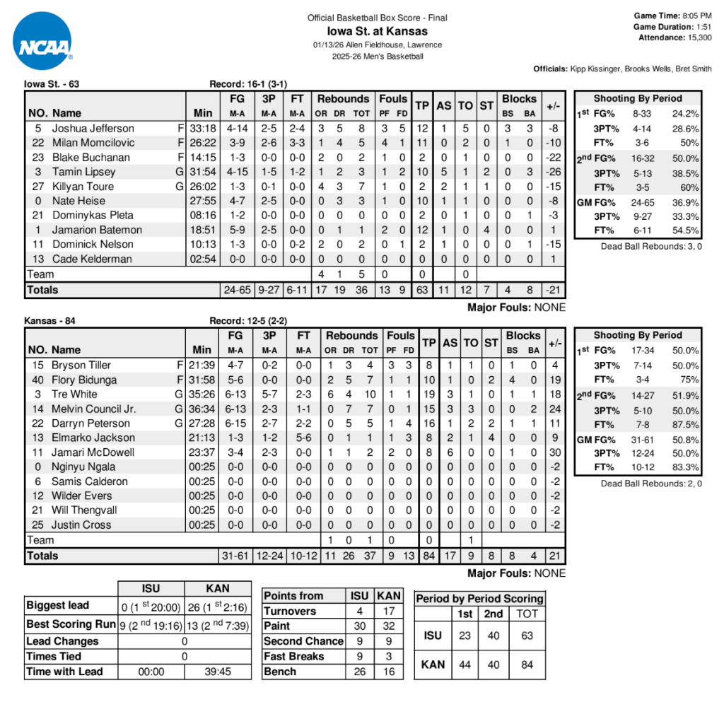 LAWRENCE, Kan. – After starting the year 16-0 and setting the best start to a season in program history, Iowa State (16-1, 3-1 Big 12) suffered its first loss of the season Tuesday evening as it fell to Kansas (12-5, 2-2 Big 12) by a score of 84-63 in Allen Fieldhouse.