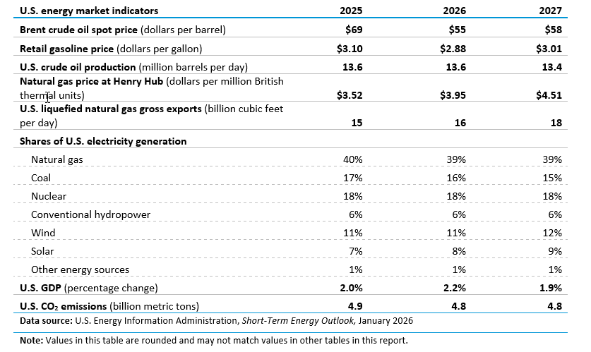 Natural gas prices: EIA expects the benchmark Henry Hub price to stay mostly flat in 2026, averaging just under $3.50 per million British thermal units (MMBtu), before rising to $4.60/MMBtu in 2027. This increase is driven by growing demand for liquefied natural gas exports and higher natural gas consumption in the electric power sector, which is expected to outpace growth in natural gas production.