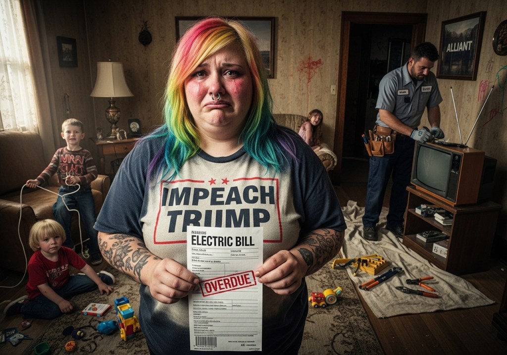 Love the picture. Apparently she can afford nose ring, tattoos and fancy t-shirt, but not her electric bill.