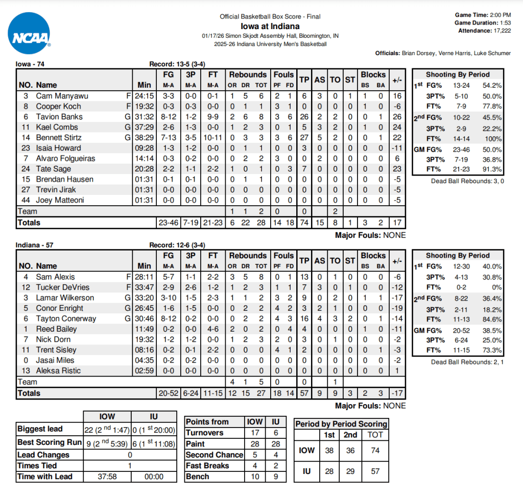 BLOOMINGTON, INDIANA – Iowa (13-5, 3-4) traveled to Indiana (12-6, 3-4) and ended a three-game skid, defeating the Hoosiers 74-57 behind huge performances from Bennett Stirtz and Tavion Banks.