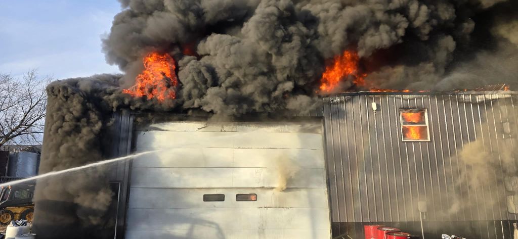 ESTHERVILLE — A massive structure fire north of Estherville drew firefighters from across the region Tuesday afternoon, as crews battled thick smoke, internal explosions, and a collapsing roof to bring a commercial-sized shop fire under control.