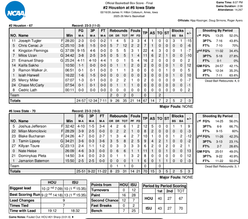 ISU went cold in the first part of the second half, helping the Cougars retake the lead at 51-47 when Isiah Harwell canned a corner 3-pointer. The UH lead increased to 58-49 with 10:48 left when Flemings took over with three buckets, including a pair of 3-pointers.