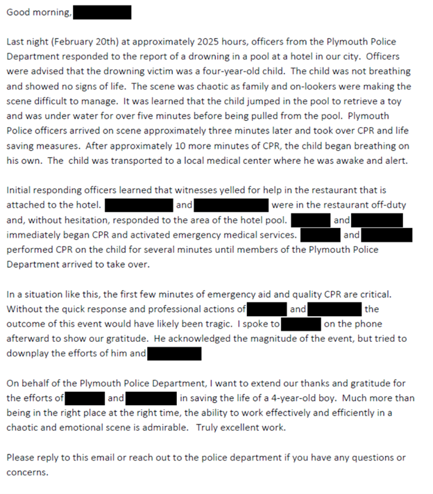 ICE received a written letter of recognition from the Plymouth Police Department, commending the agents for their heroic actions and professionalism during this terrifying incident.