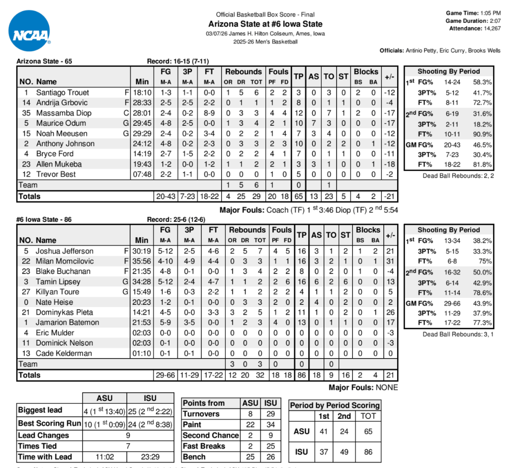 The Cyclones forced eight turnovers in the first eight minutes of the second half, picking up easy buckets off the Sun Devil miscues. Momcilovic hit a pair of 3-pointers, and Jefferson scored six points in the rally as the Cyclones led 65-45 with 8:31 remaining to put an exclamation point on the game.