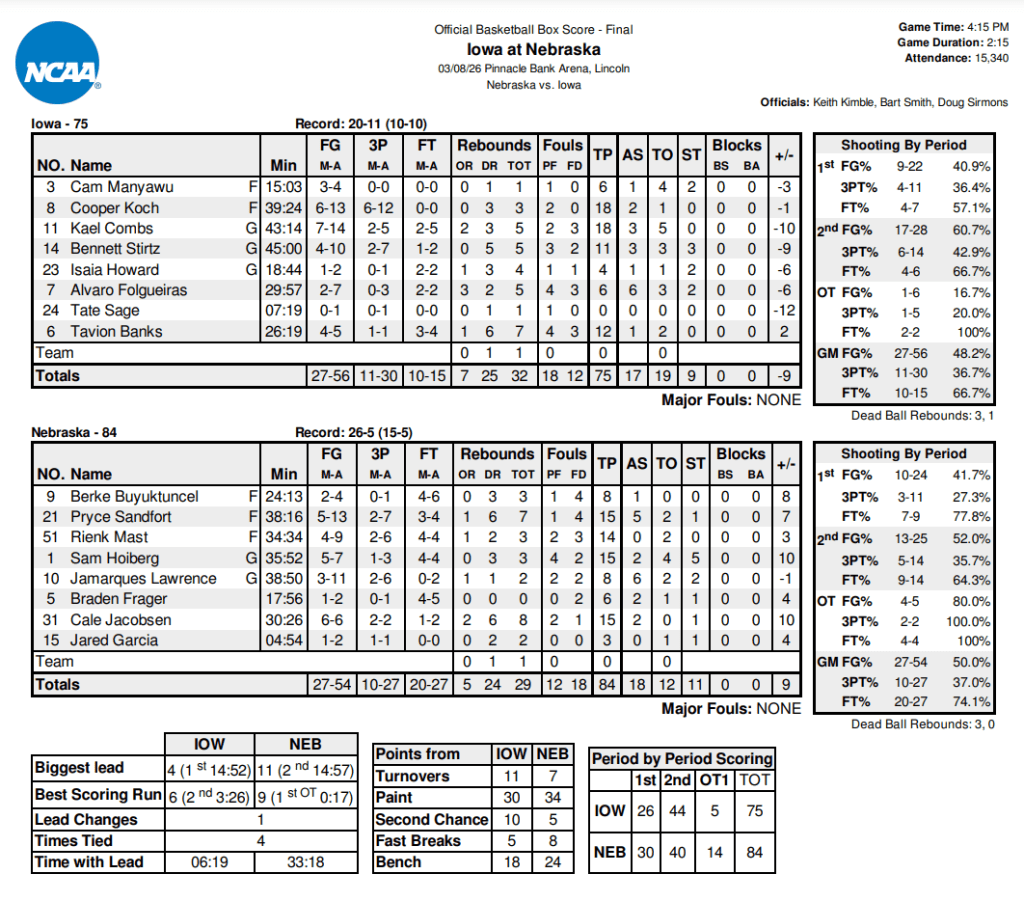 Iowa erased multiple double-digit deficits in the second half, including an 11-point margin and a 10-point gap with just over five minutes remaining. Trailing 64-54 with 5:13 to play, the Hawkeyes mounted a 16-6 run to pull even. Junior Kael Combs spearheaded the late surge, scoring Iowa’s final eight points of regulation, punctuated by a dramatic 3-pointer with only 2.7 seconds left to tie the game at 70. However, the momentum shifted back to the Huskers in overtime as they outscored Iowa 14-5, fueled by two critical 3-pointers from reserve Cale Jacobsen.