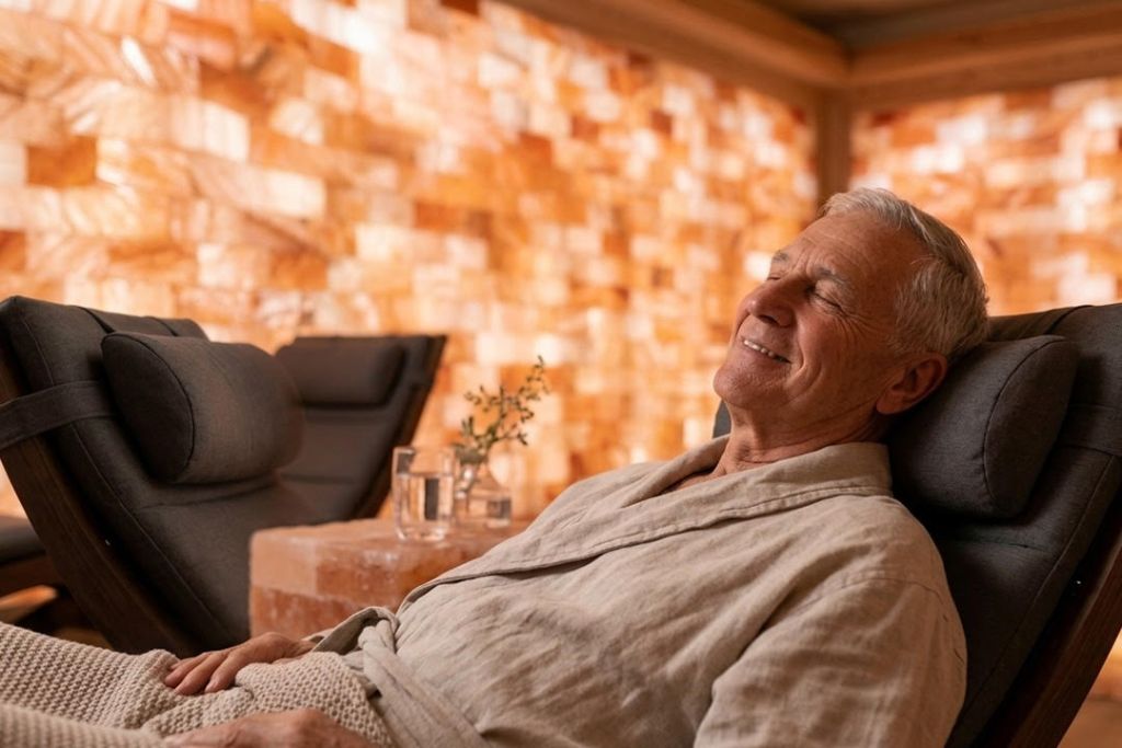 In senior living environments, reducing visual strain is important. A salt wall does not produce glare like polished surfaces might. Instead, Himalayan salt diffuses light in a way that feels steady and controlled.